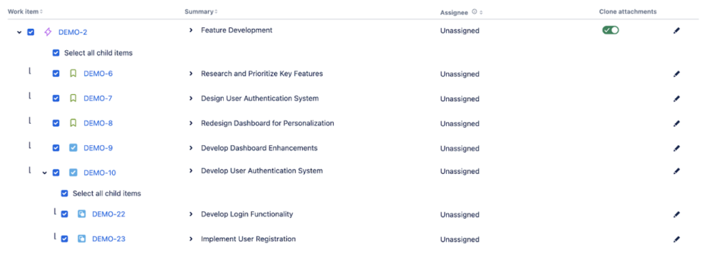Epic Clone replicates entire structures — from top-level parent issues through all nested children — including issue links and parent-child relationships. No manual rebuilding required after the fact. Read more about issue hierarchy cloning in Jira.