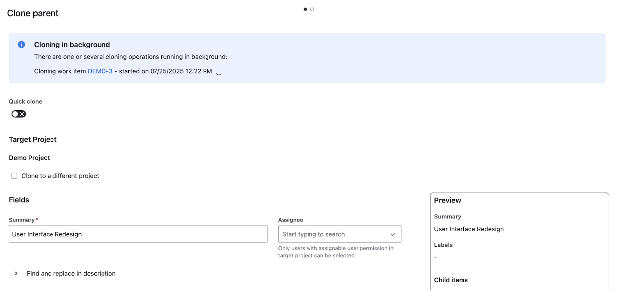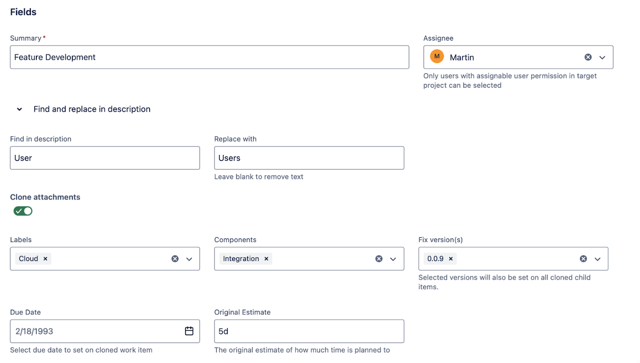 Rather than building separate rules for each field update, Epic Clone lets you modify target project, assignee, labels, components, due dates, and more in a single cloning operation. You decide exactly what gets cloned and what gets changed.